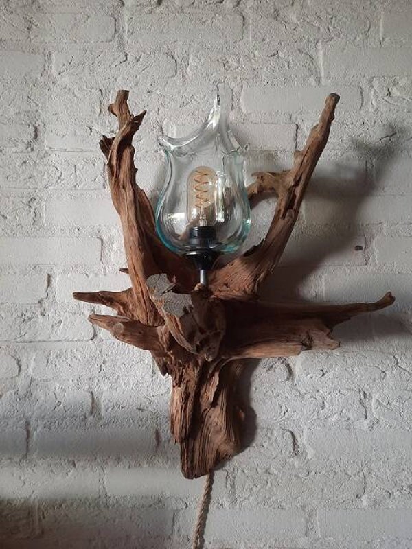 Mooi eiken wortelhout met daar op glazen kelk. Glazen kelk is geproduceerd door Glas & Art Katinka Waelbers in Ravenstein. Hoog 60 breed 47 cm,