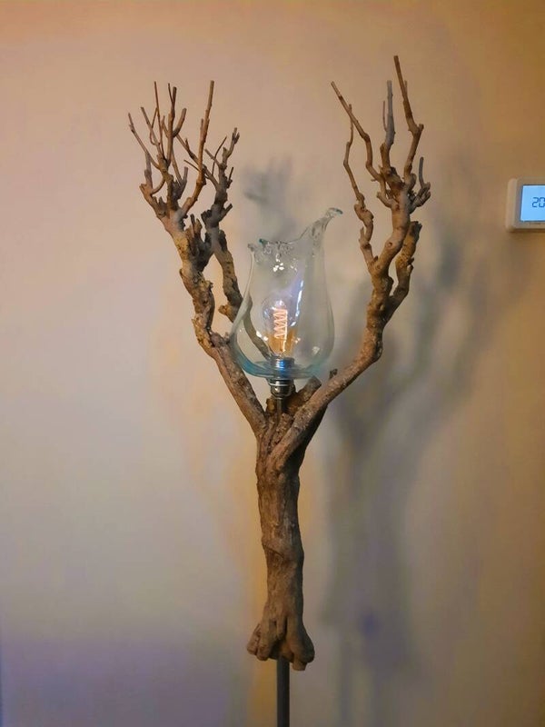 "Made bij Gijs" Seringentak op tempel ornament, glazen kelk van Kalinka Wealbers uit Ravenstein. 4 Watt ledlamp met vloerdimmer. Verzending in overleg